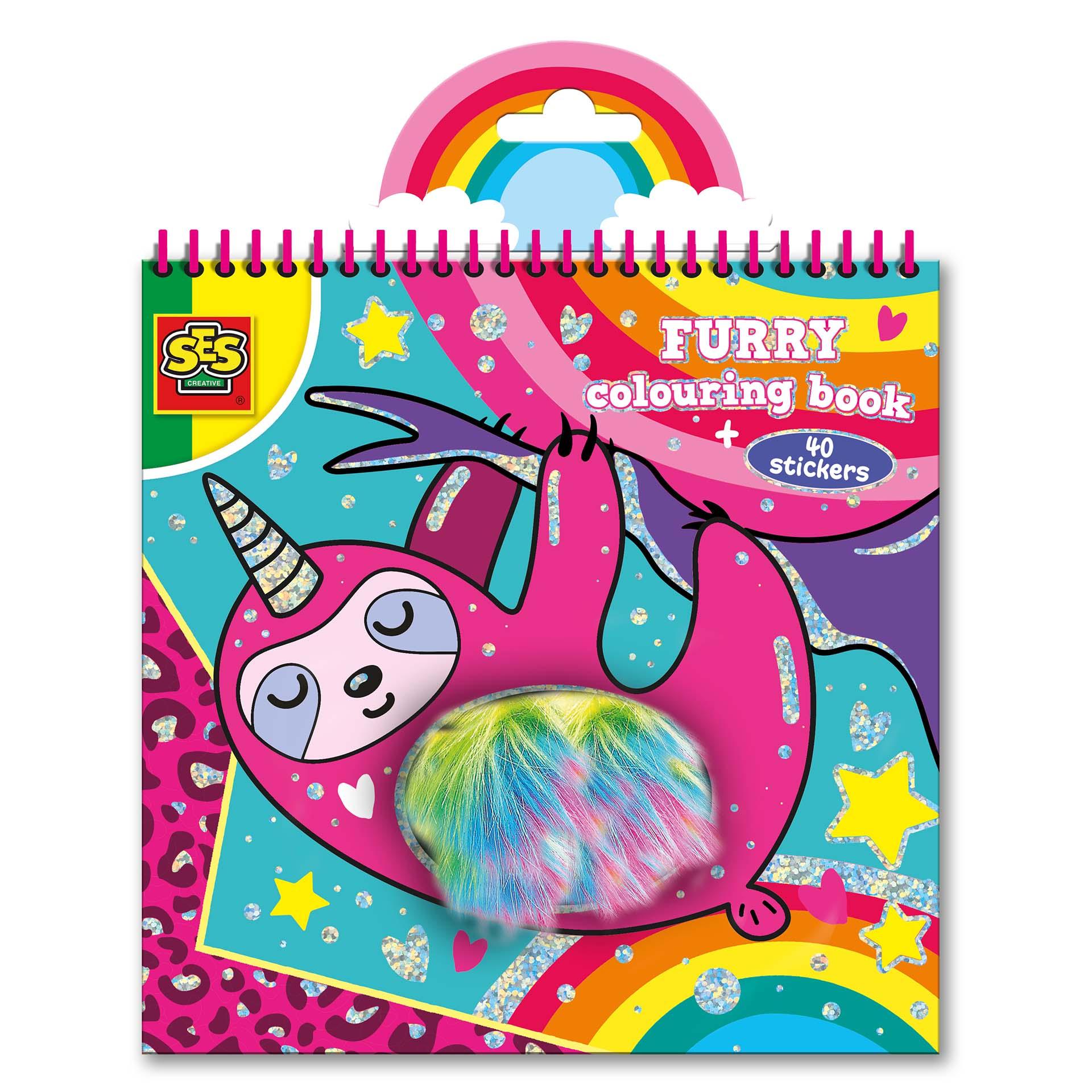 Contine: carte de colorat cu blana in culorile curcubeului pe fiecare pagina, 15 foi de colorat si 40 de stickere sclipitoare.