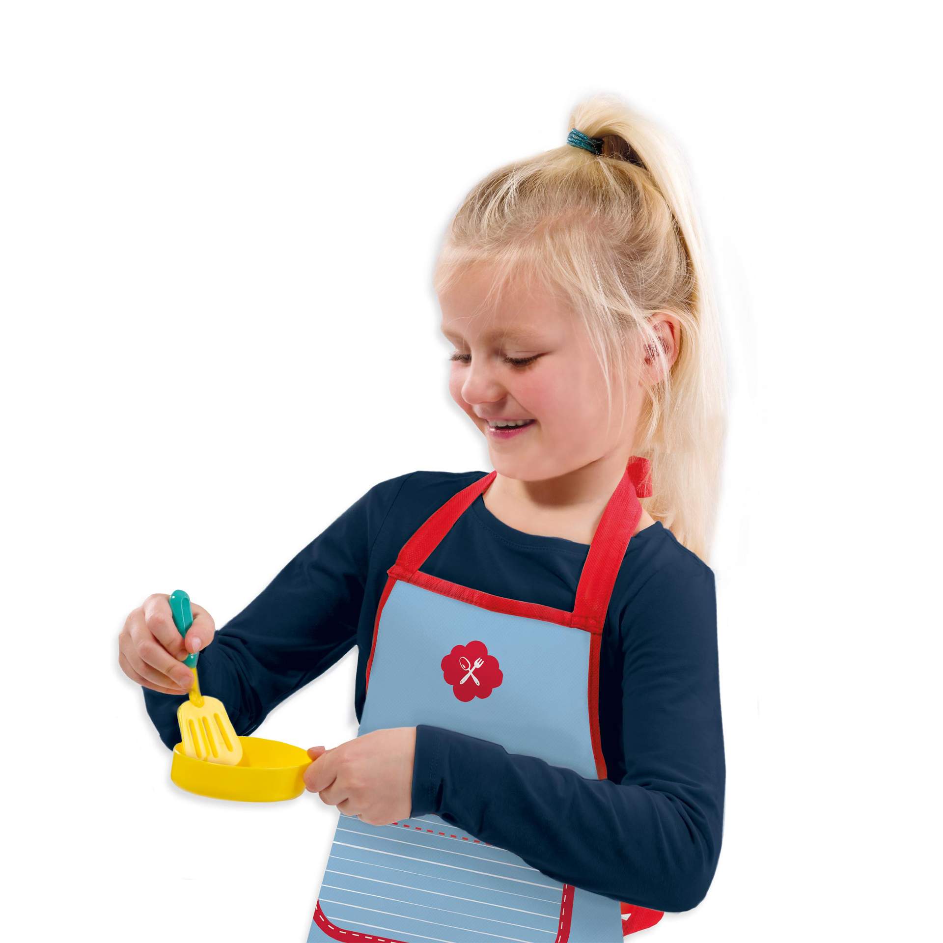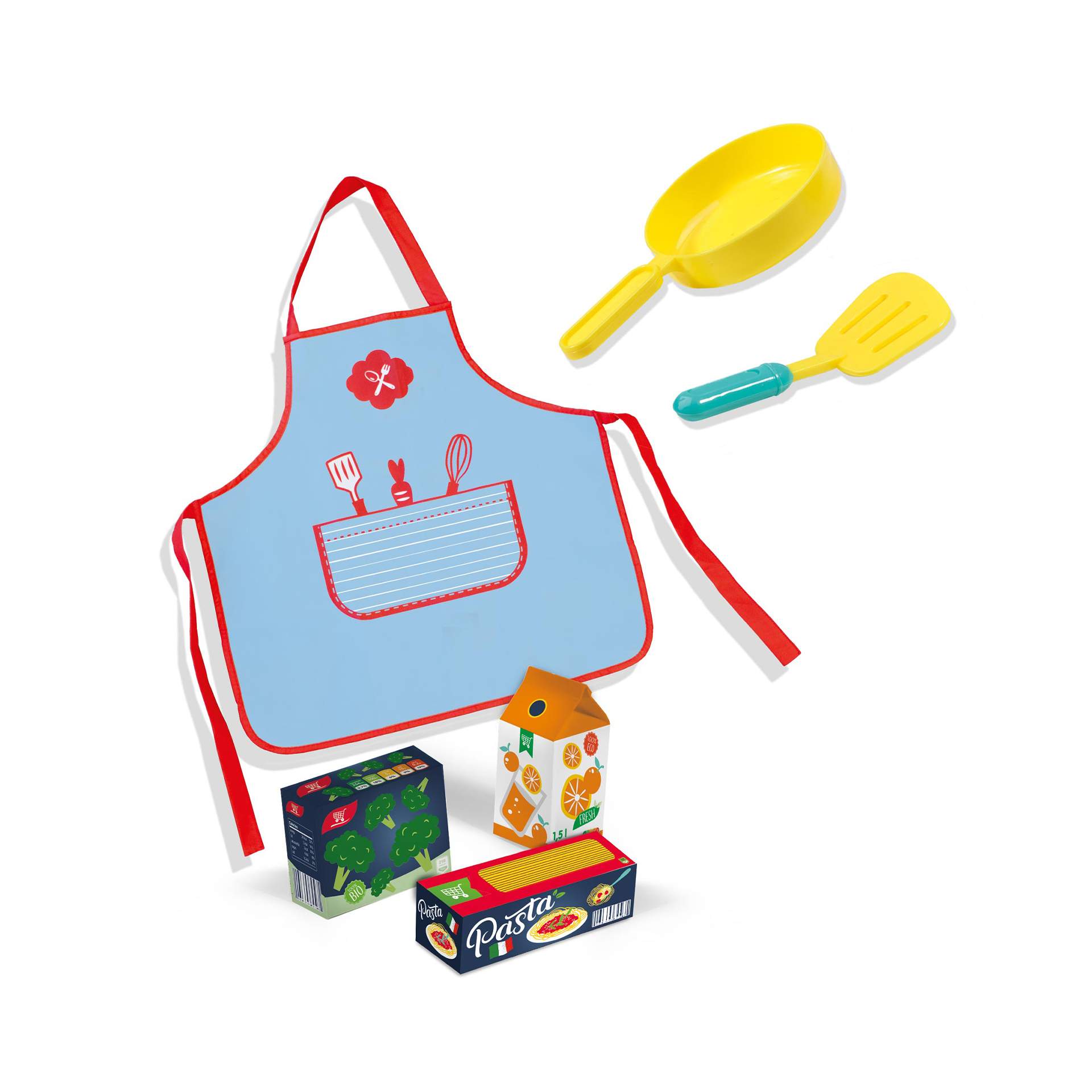 Costum de bucatar cu accesorii pentru copii. Vrei sa fii un bucatar adevarat? Acest lucru este posibil cu acest kit de imbracaminte! Invitati bunica si bunicul la o cina delicioasa. Ce fel de deliciu este in meniu astazi? Acest kit de imbracaminte contine nu numai un sort de bucatar, ci si o tigaie, o spatula si trei produse de magazin. De asemenea, se potriveste cu celelalte produse de magazin si gatit din colectie.
