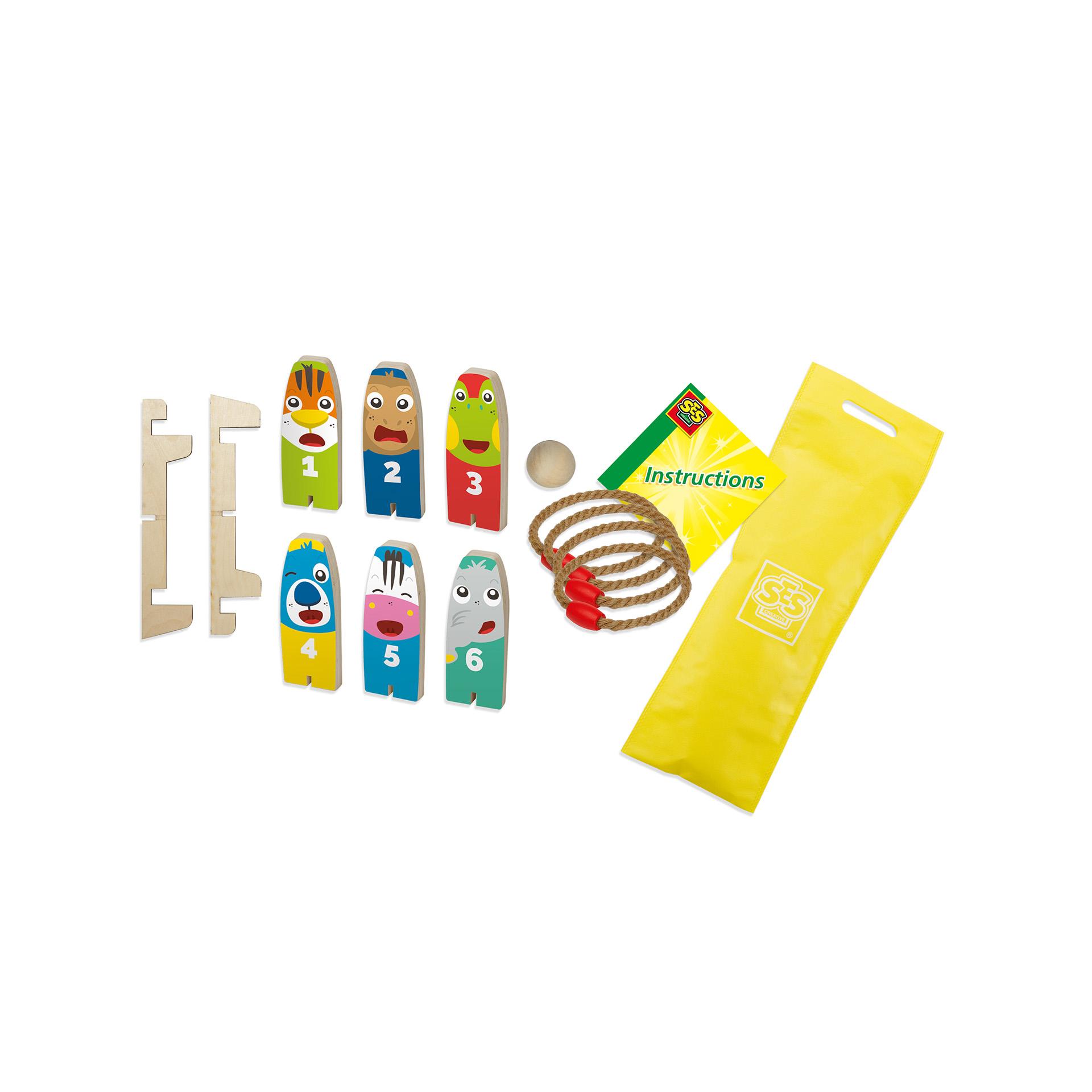 Contine: 6 piese de bowling/ring; 1 bila de lemn Ø40mm; cadru din lemn pentru aruncarea inelului; 4 inele de franghie; geanta de depozitare textila; instructiuni.
