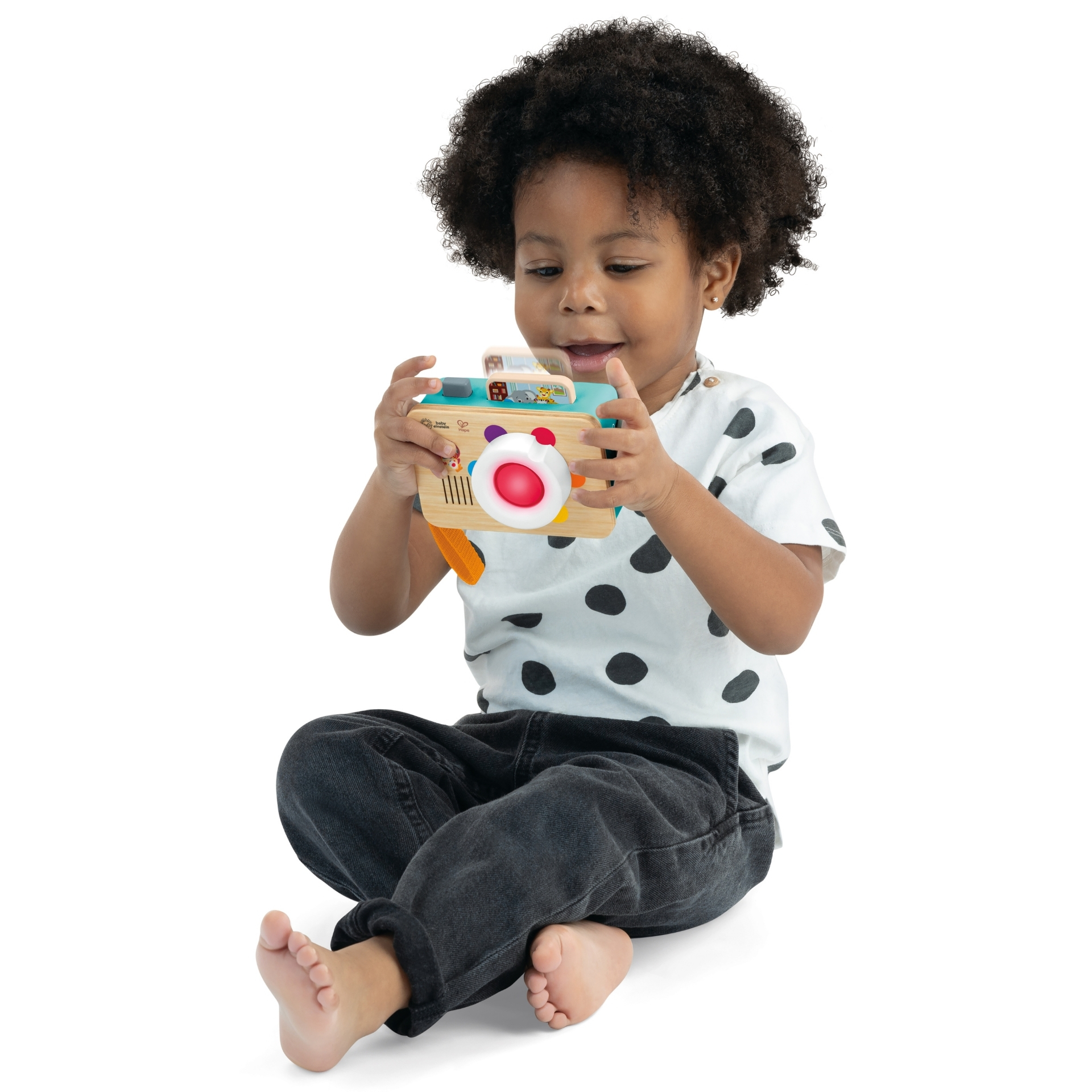Rasuciti lentilele pentru lumini, nume de culori si sunete ale camerei. Apasati butonul pentru a vedea o imagine pop-up pentru invatarea cauzei si efectului. Oglinda pe spate pentru autodescoperire. Schimbati limbile: engleza, spaniola, franceza si germana. Curea de mana pentru joaca din mers.