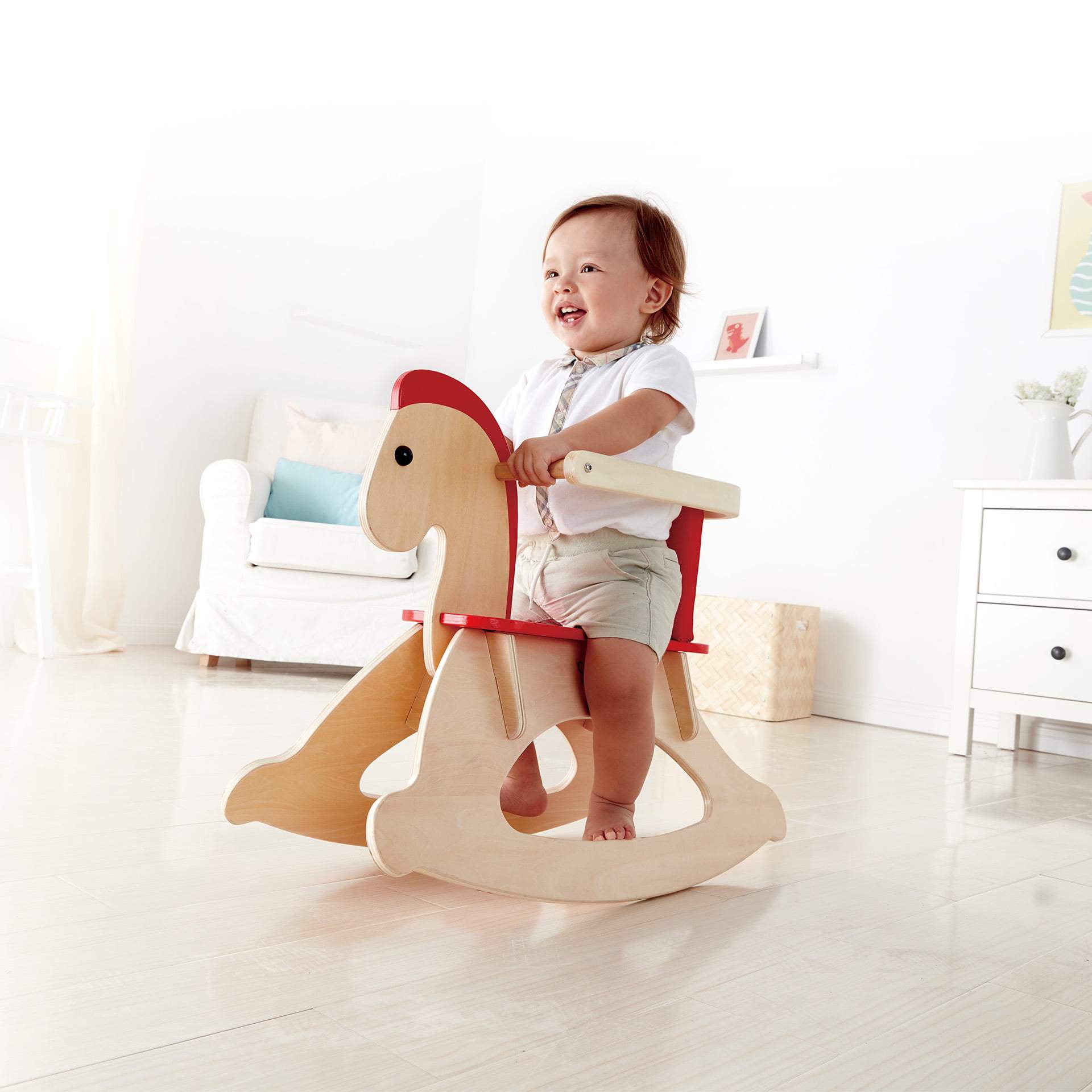 Bara de protectie a calului balansoar din lemn ii ajuta pe bebelusii de pana la zece luni sa ramana pe loc si poate fi indepartat pe masura ce micutul tau castiga incredere.