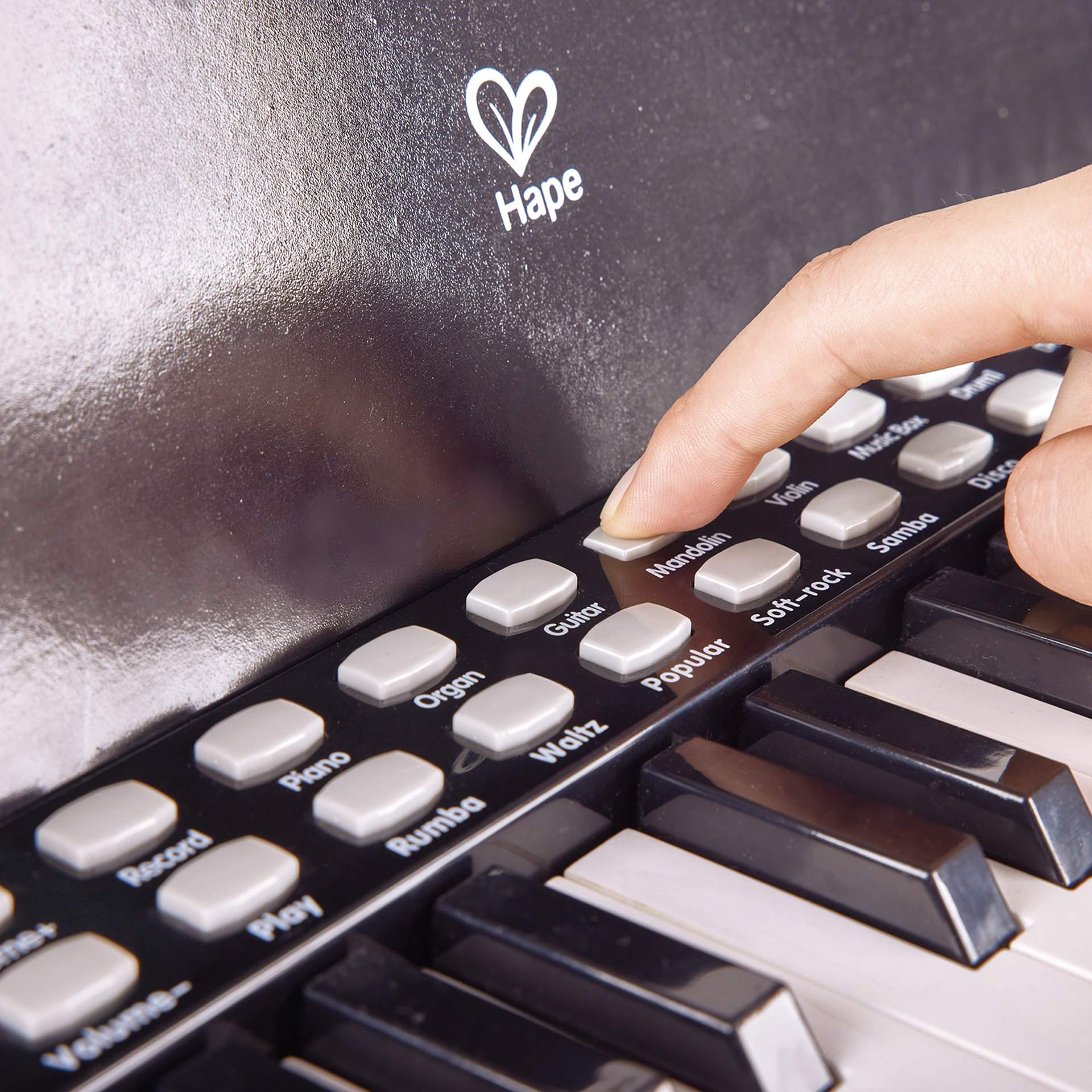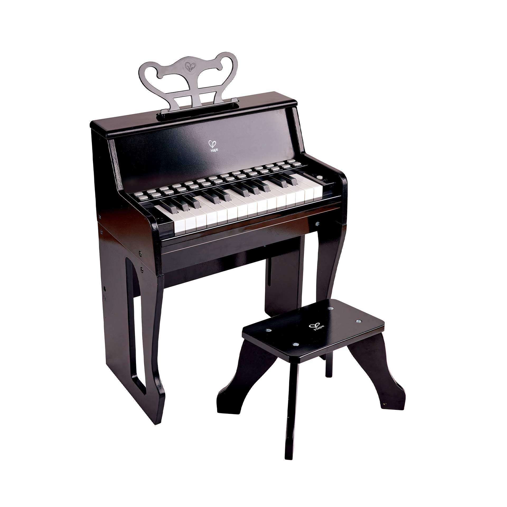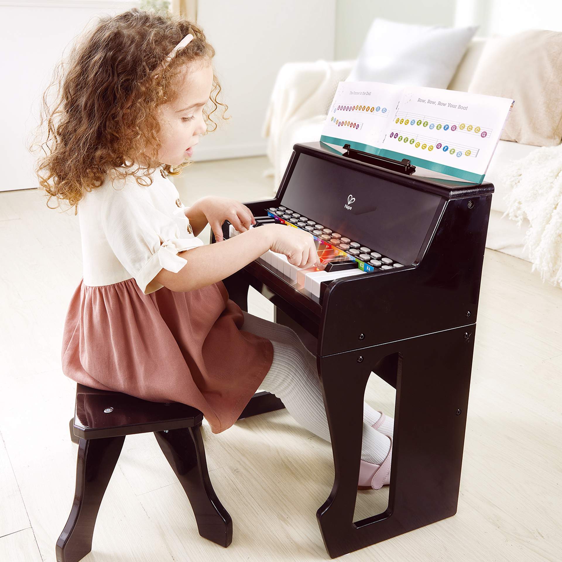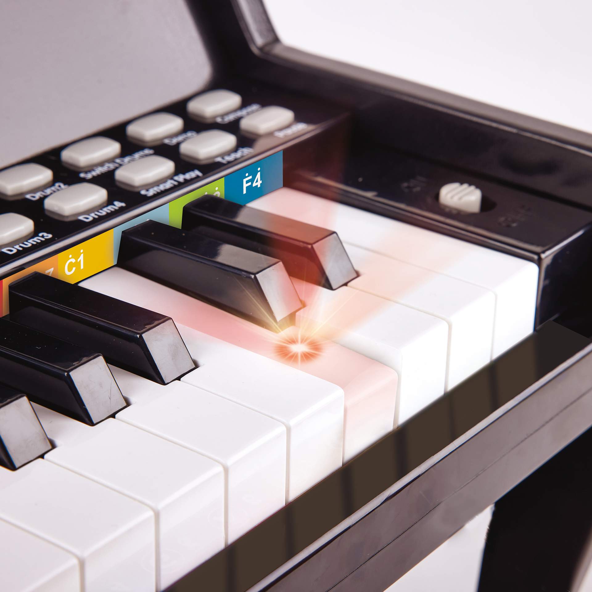 Jucarie din lemn copii – Pian negru cu scaun – invat sa cant cu lumini – Pian electric cu 25 de taste, cu taste iluminate. Alimentat de 4 baterii AA (incluse) sau cablu USB inclus. Urmati tastele luminoase pentru a invata cum sa cantati, apoi cand sunteti mai increzator, puteti sa va selectati propriul instrument si sa cantati impreuna cu una dintre cele sase melodii stilizate si opt batai de tobe cu tempouri reglabile.