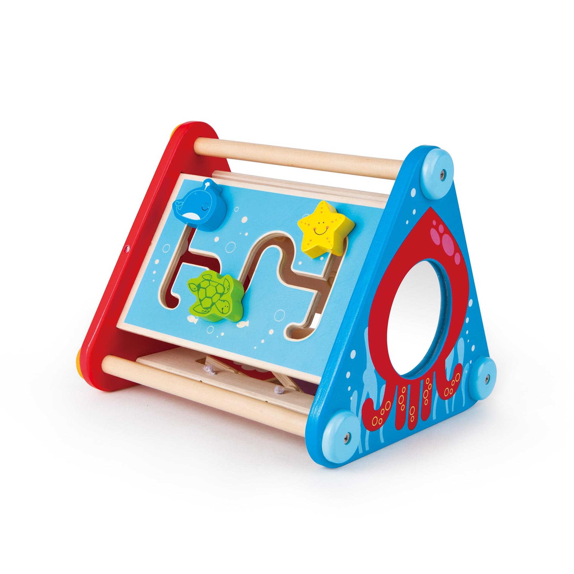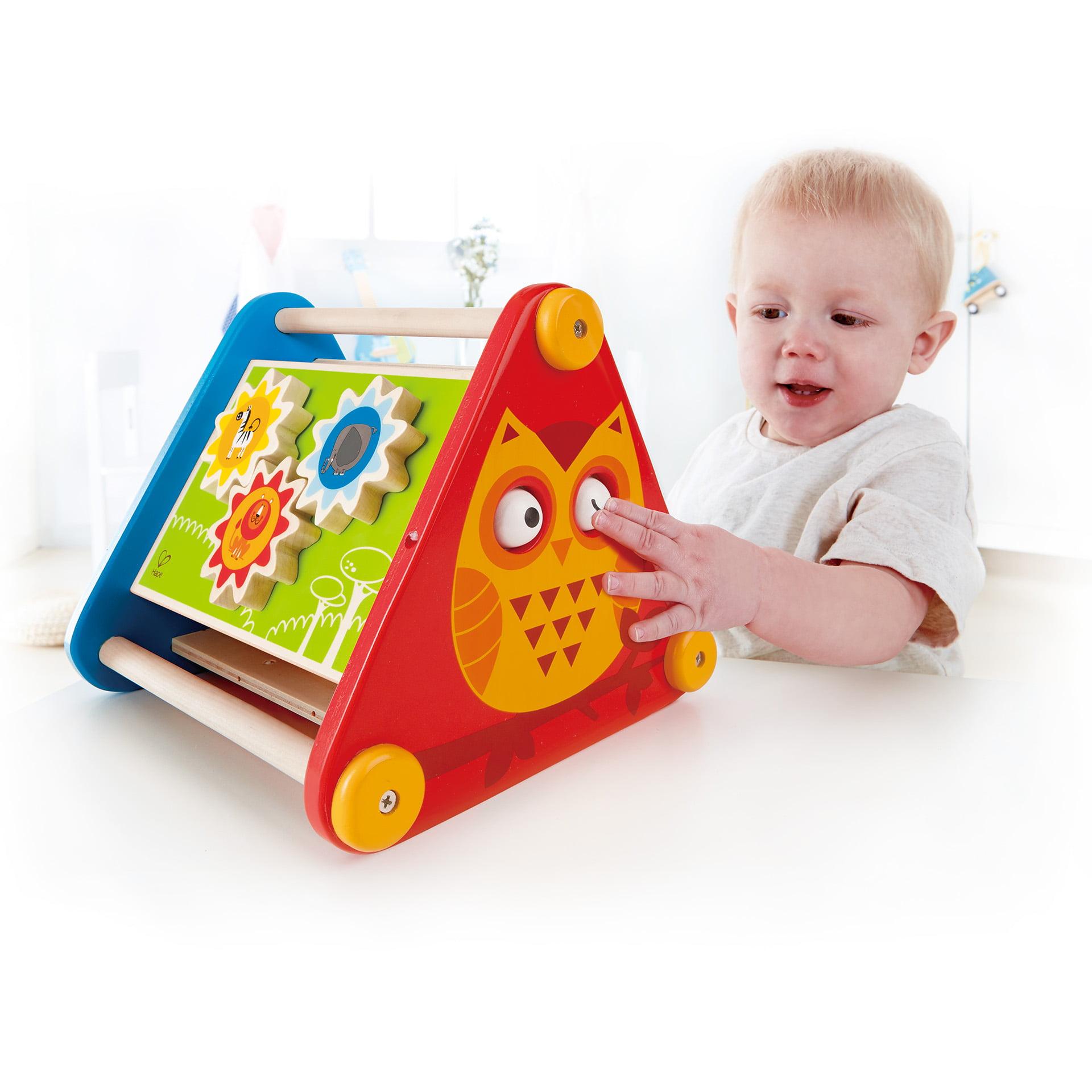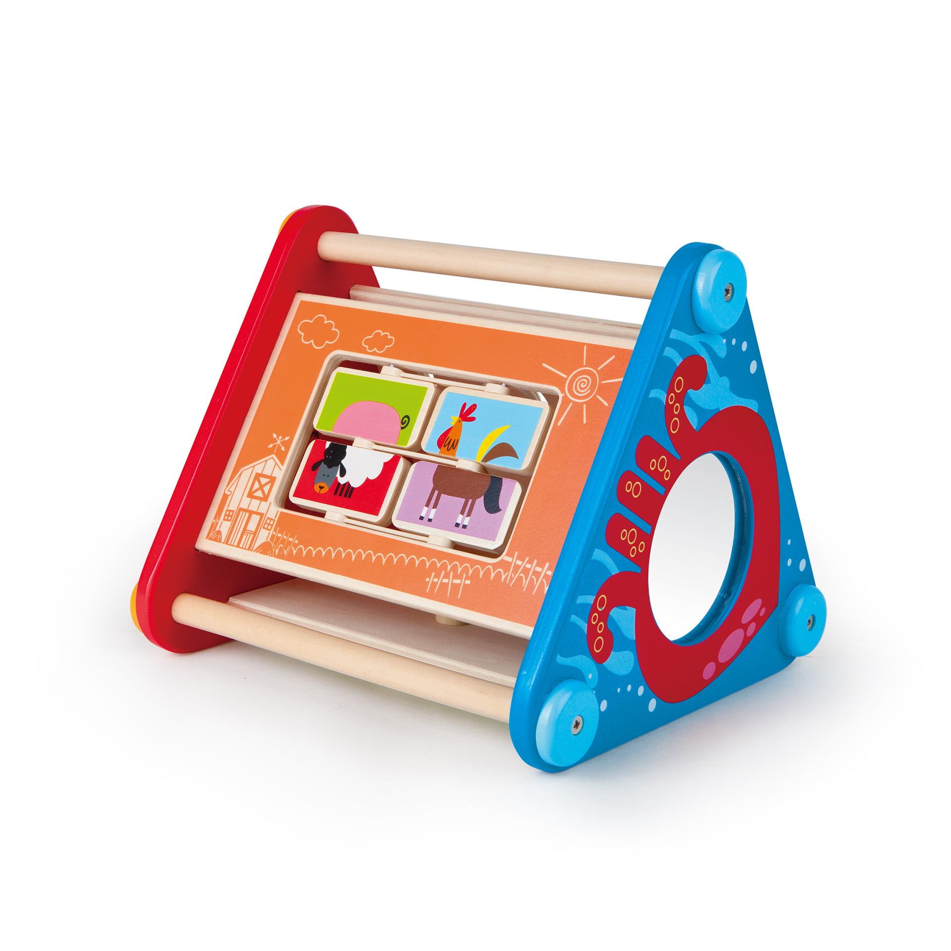 Triunghiul cu 5 activitati diferite, ideal pentru orice copil cu varsta peste 10 luni. Umple ziua si alunga plictiseala cu aceasta cutie plina de provocari si actiune. Acest joc cu mai multe activitati pe 5 fete, are angrenaje, bile, blocuri rotative, multe culori si miscare, precum si un labirint si-o oglind pentru a reflecta zambetul copilului tau.