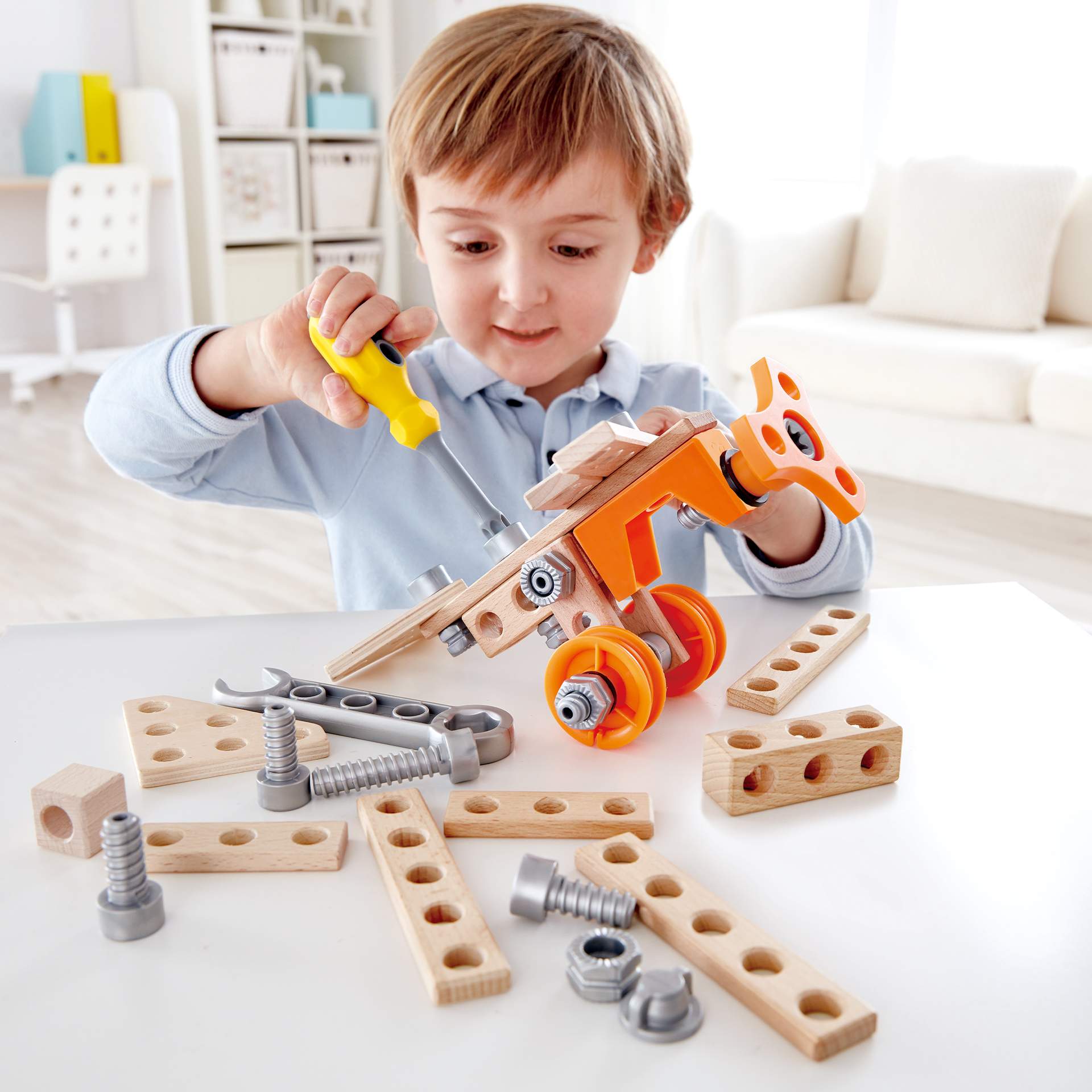 Jucarie din lemn – Kit de pornire pentru experimente (42 piese) – Foloseste-ti imaginatia pentru a crea orice poti evoca cu acest set de 42 de piese. Uneltele si componentele acestui set de joaca sunt usor de utilizat si perfecte pentru mainile mici si nivelul de calificare adecvat pentru copii.
