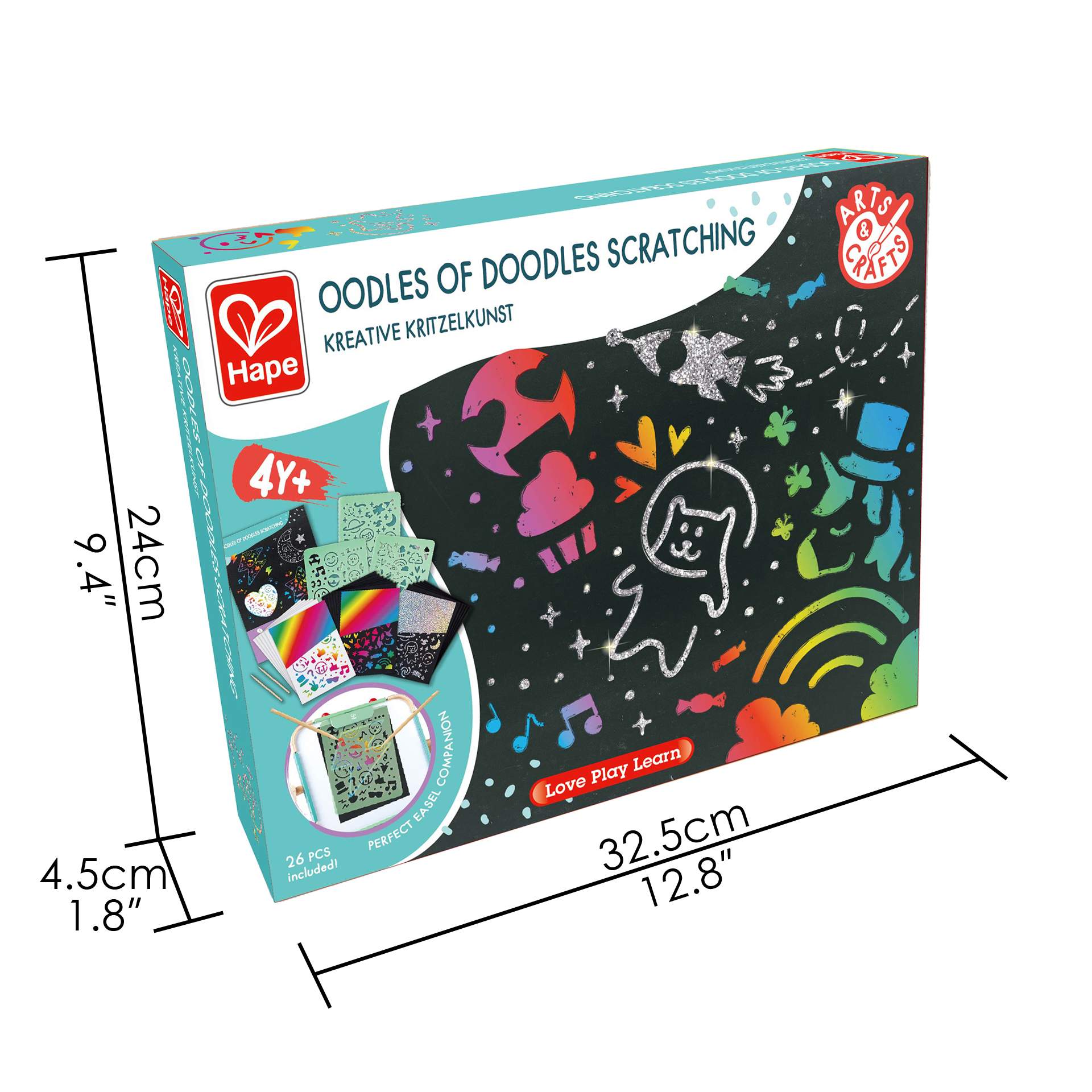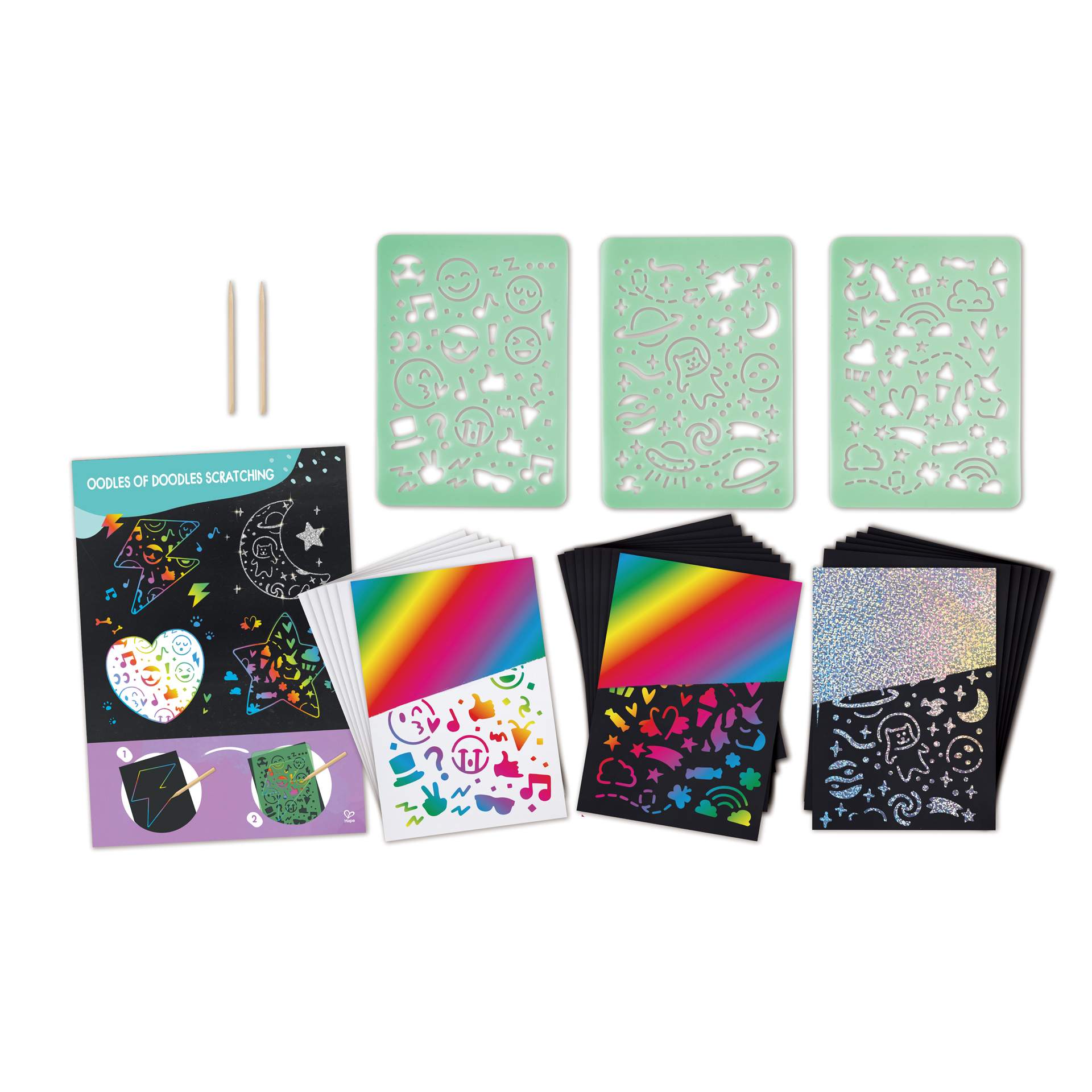 Asezati sabloane peste una dintre cele 20 de foi incluse si zgariati usor cu batul din lemn pentru a dezvalui curcubeul sau stratul de sclipici de dedesubt! Utilizati sabloanele in combinatie pentru a crea arta minunata de doodle.