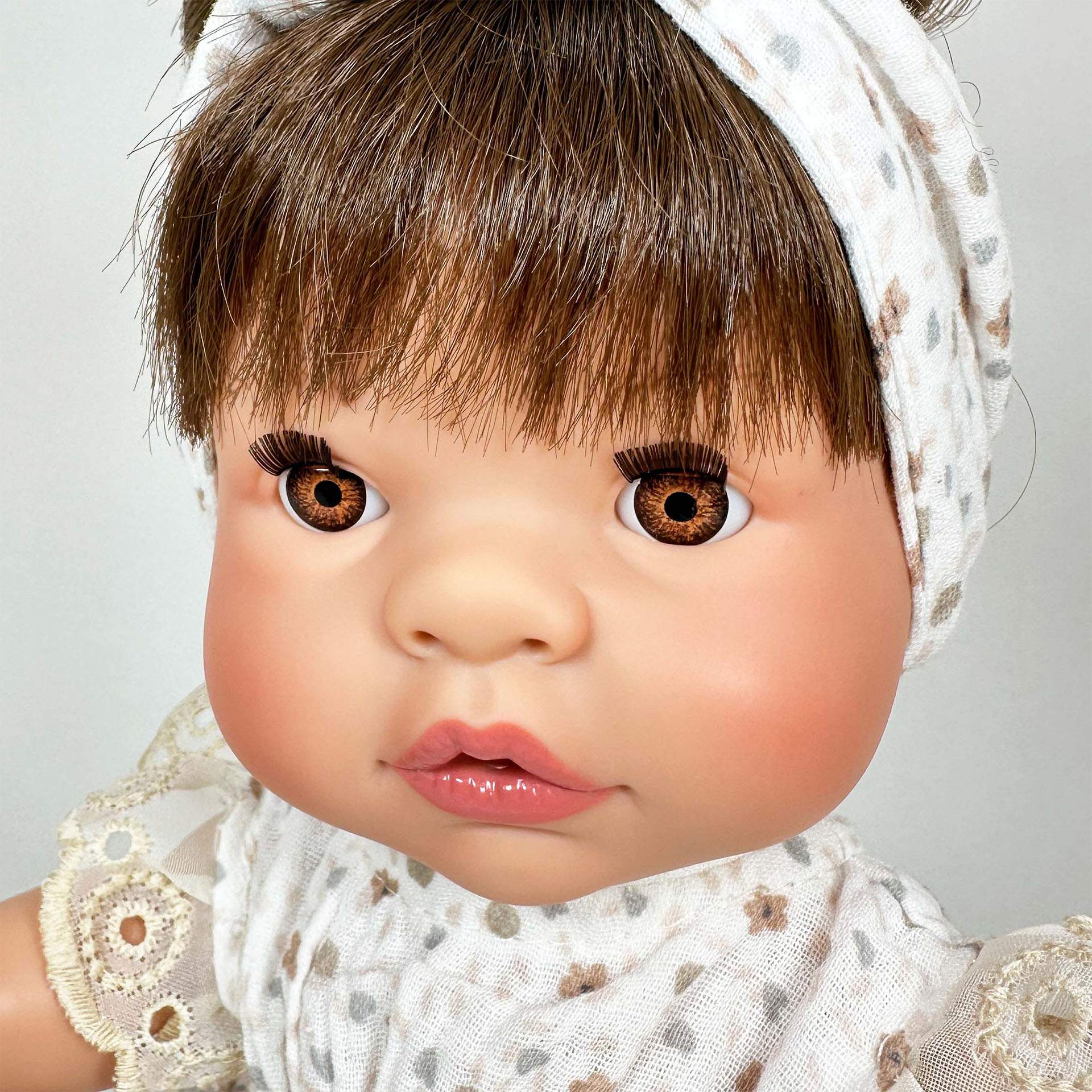 Papusa Nines D’Onil, Joy, cu parul saten, cu bentita alba, cu miros de vanilie, 37 cm