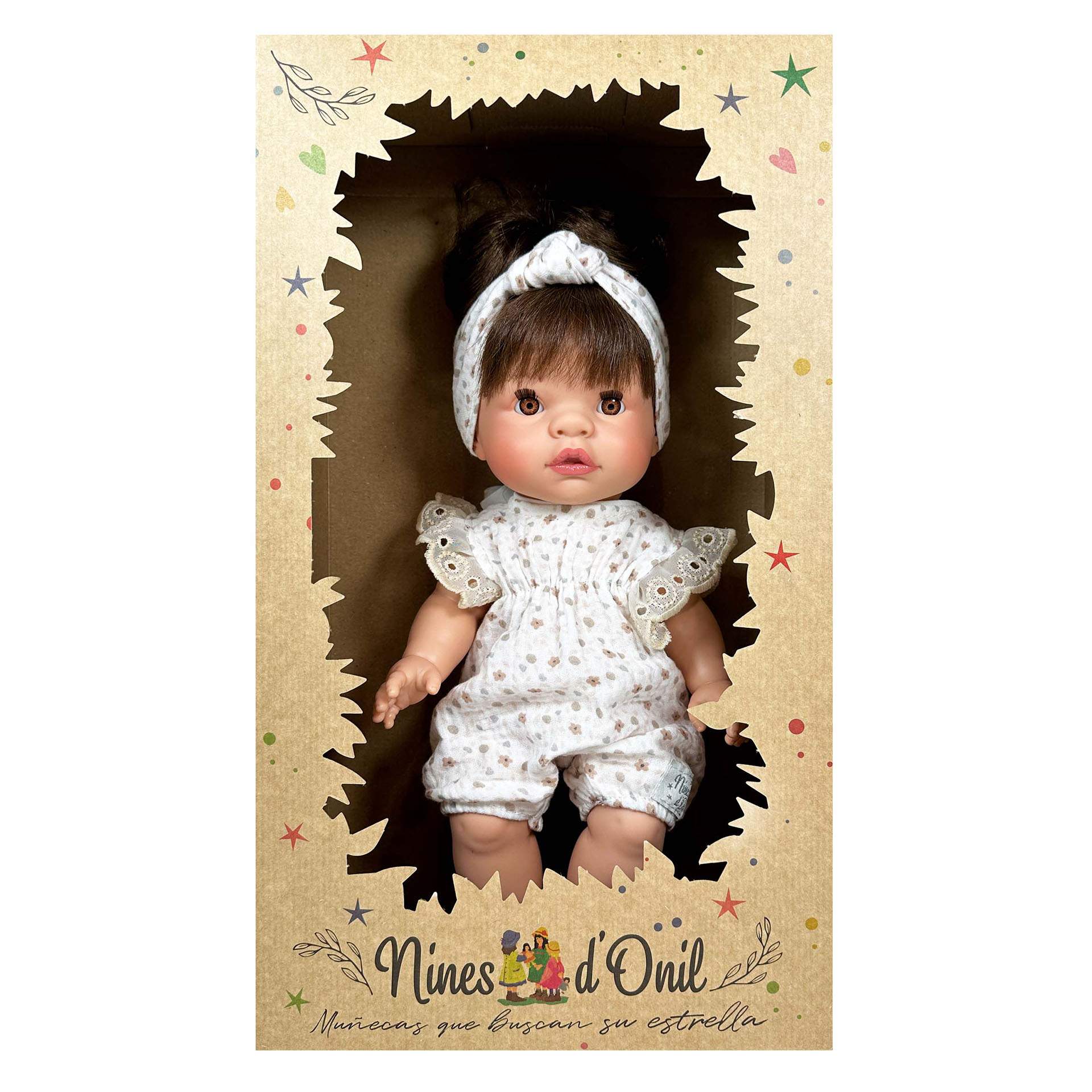 Papusa Nines D’Onil, Joy, cu parul saten, cu bentita alba, cu miros de vanilie, 37 cm – Aceasta adorabila papusa de la Nines d’Onil face parte din colectia Joy fabricata in Spania folosind materiale de cea mai inalta calitate din vinil ecologic si non-toxic. Sunt subtil parfumate cu un parfum de vanilie si sunt suficient de mici pentru a le tine micutul.