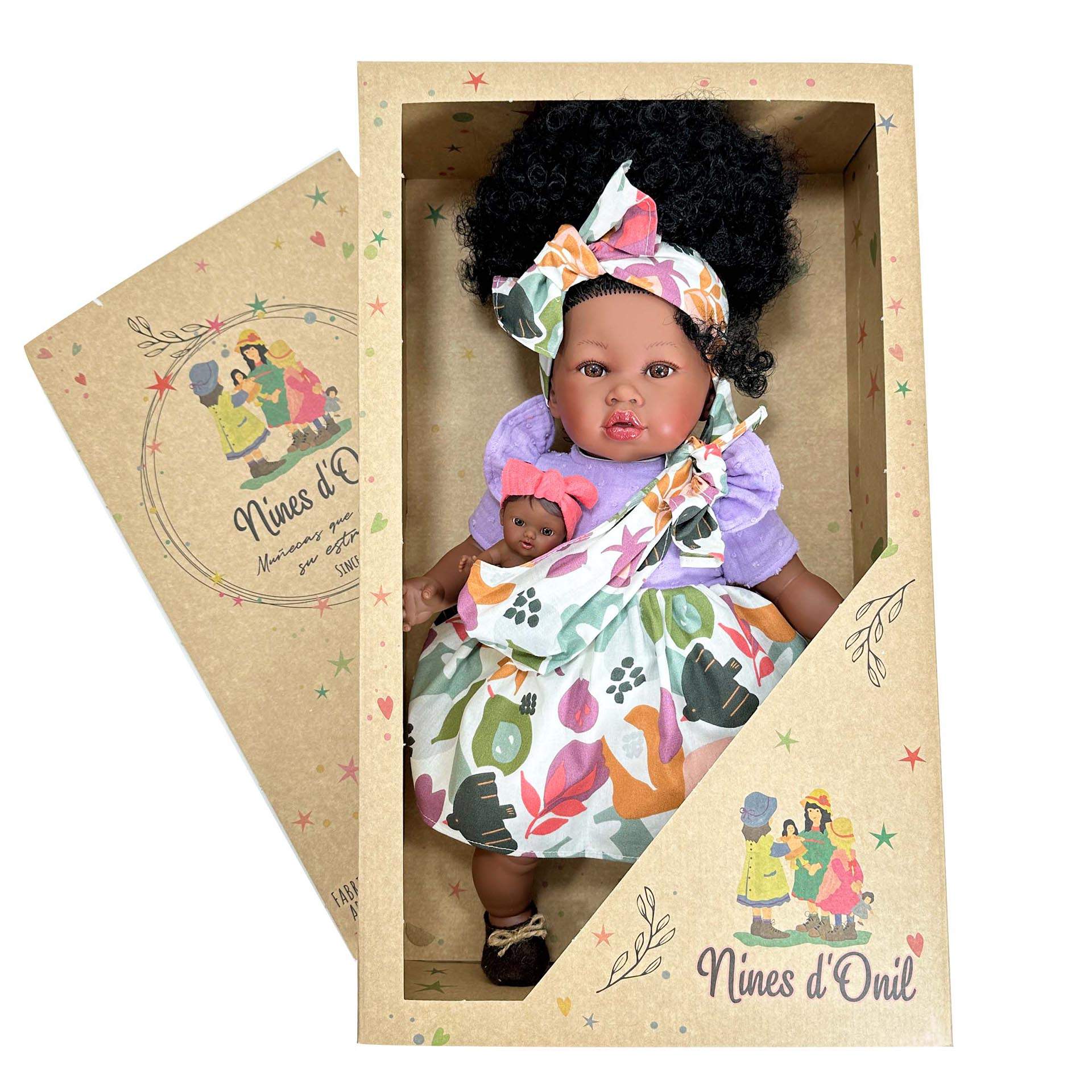 Papusa Nines D’Onil, Maria Afro, cu sunete, cu bebelus, cu rochie mov, cu miros de vanilie, 45 cm.