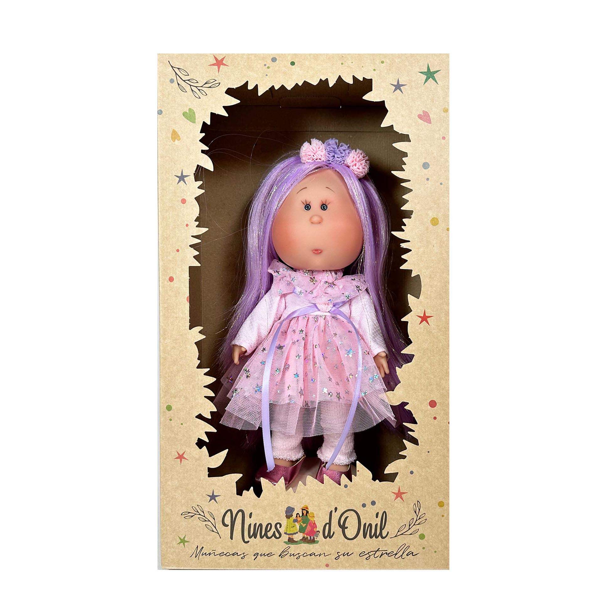 Papusa Nines D’Onil, Mia, cu parul mov, cu sclipici, cu articulatii, cu miros de vanilie, 30 cm.