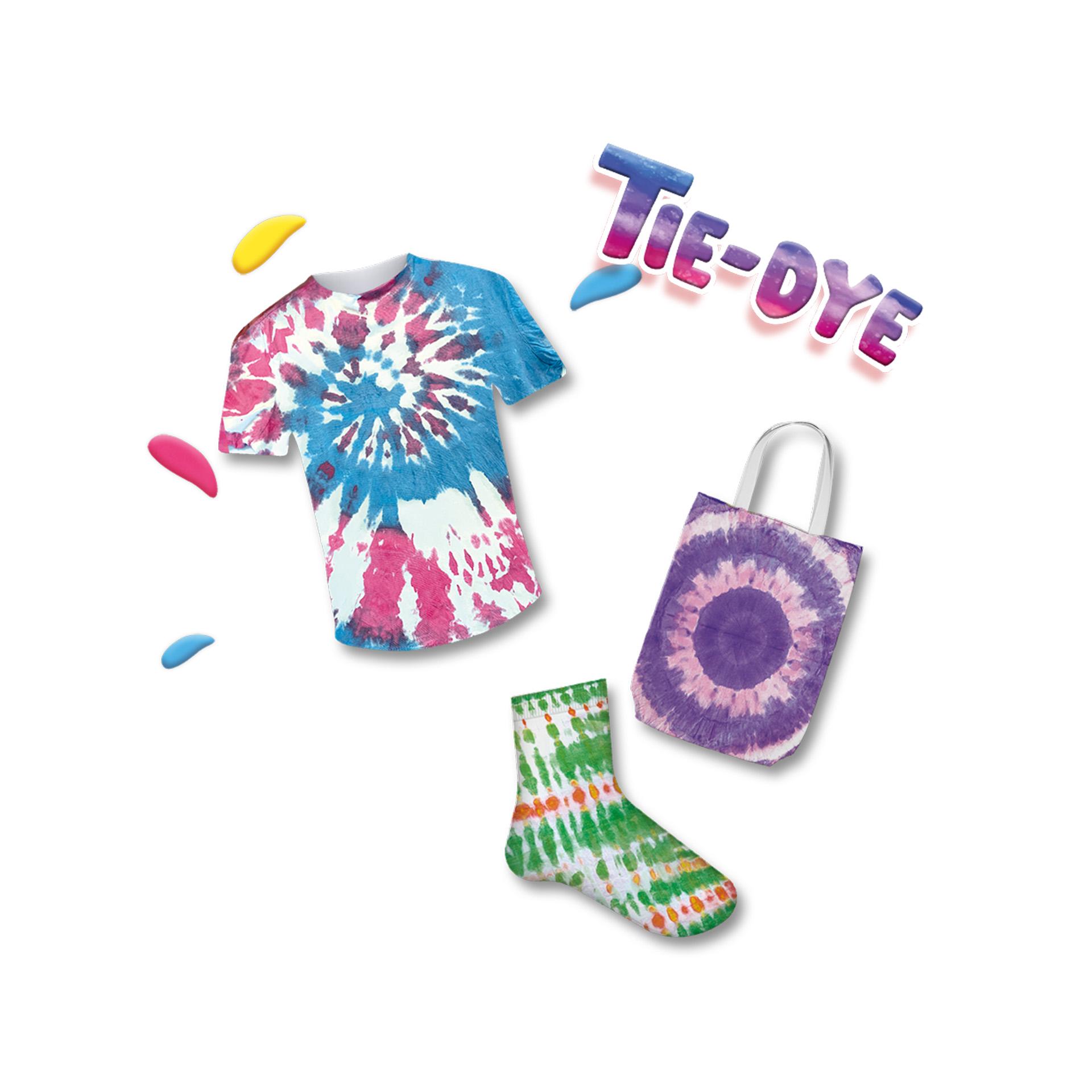 Fura spectacolul cu propriile tale creatii de tie-dye! Cu acest set de tie-dye, poti decora diferite articole, cum ar fi o pereche de sosete, pantaloni, camasi, genti sau fete de perna. Rulati, mototoliti sau pliati articolele, prindeti-le cu niste benzi elastice si sunteti gata sa le vopsiti. Urmeaza instructiunile si realizeaza desene frumoase. Ruland articolele in diferite moduri, vei obtine modele diferite.
