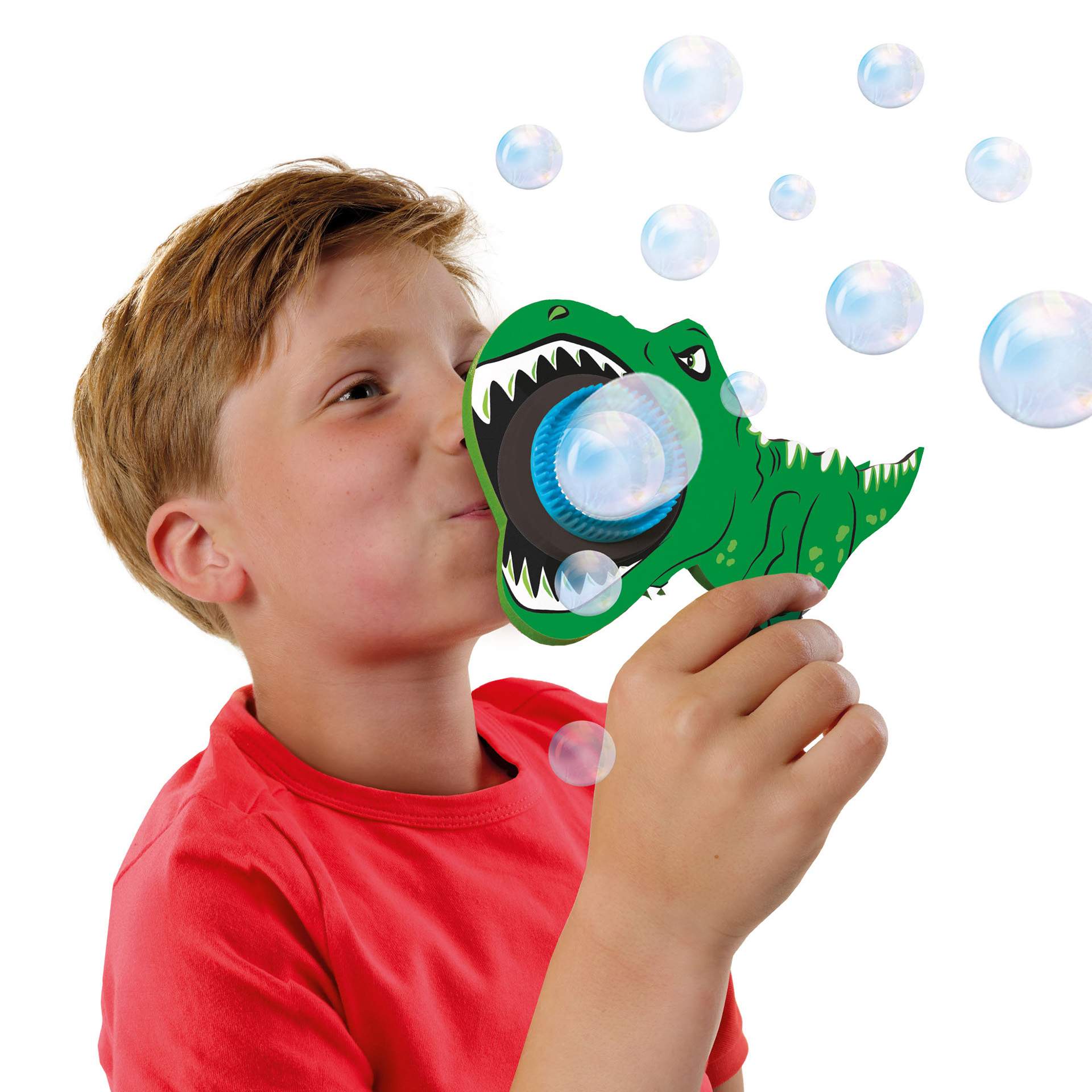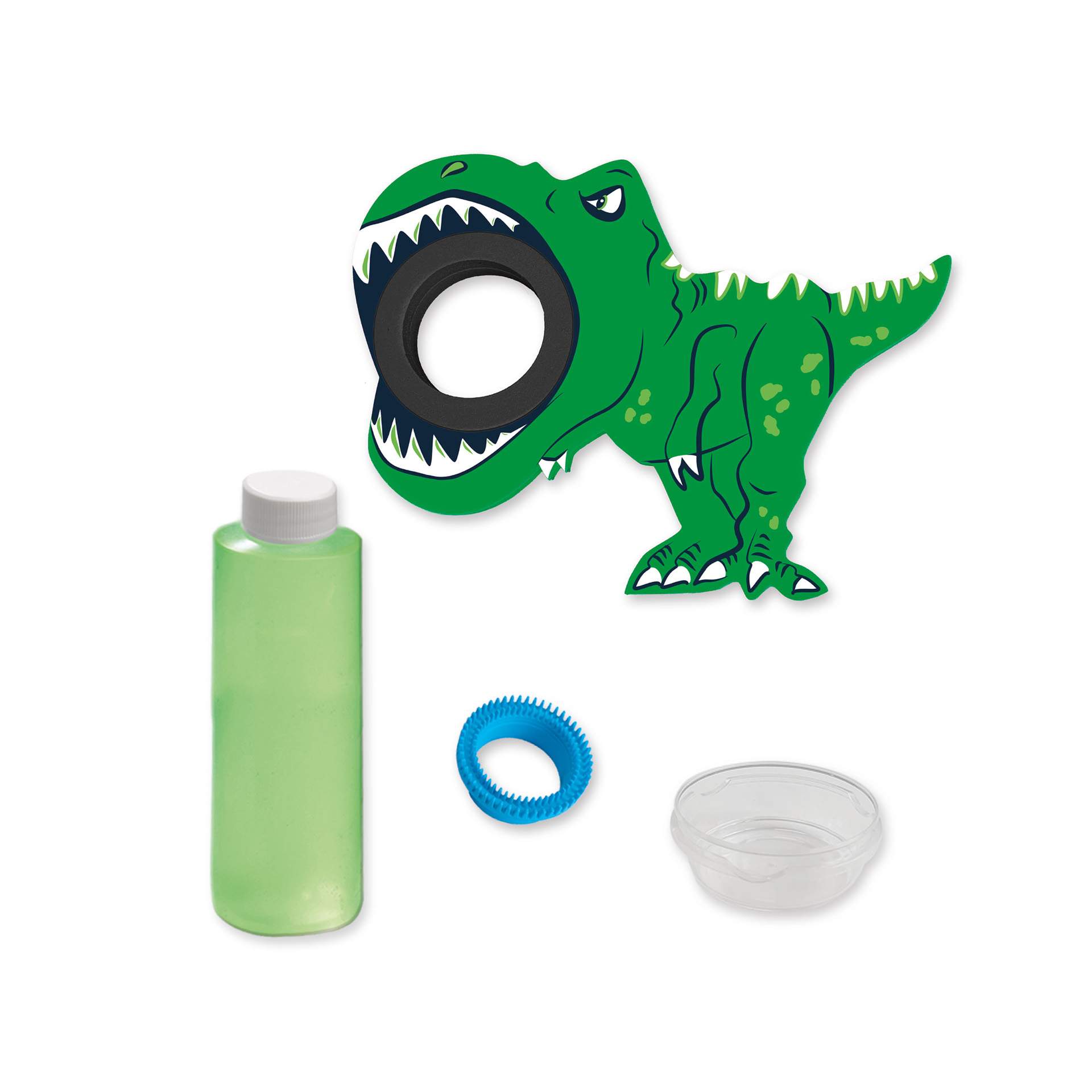 Contine: suflanta cu bule de dinozaur din spuma; inel de suflare a bulelor; 200 ml solutie cu bule; farfurie.