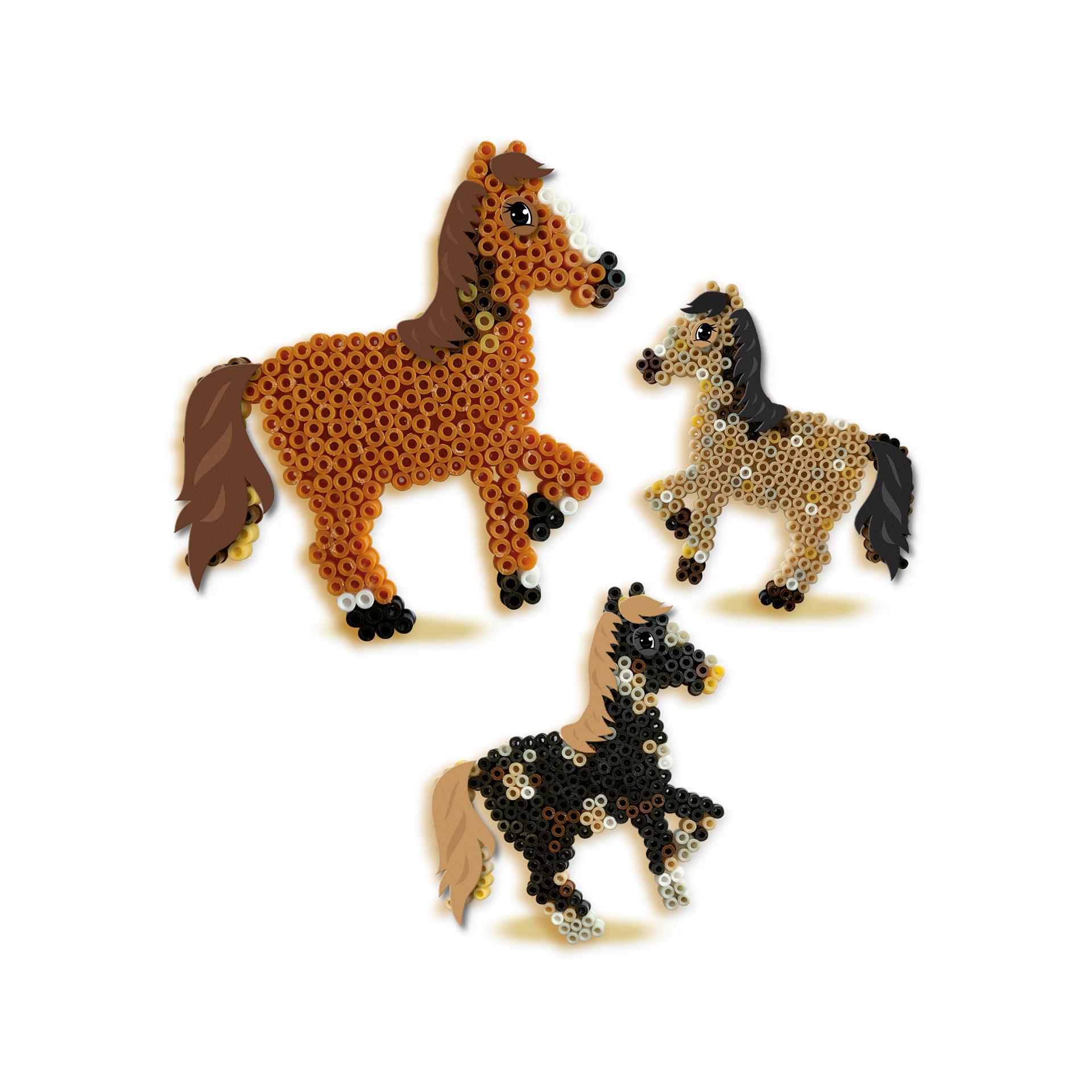 Cu acest set de calcat pe margele, poti sa faci cei mai draguti cai. Alege culorile tale preferate si aseaza margele de calcat pe placa. Calcati-va opera de arta. Adaugati finisajul calului cu autocolantele furnizate. inclusiv coame si cozi.
