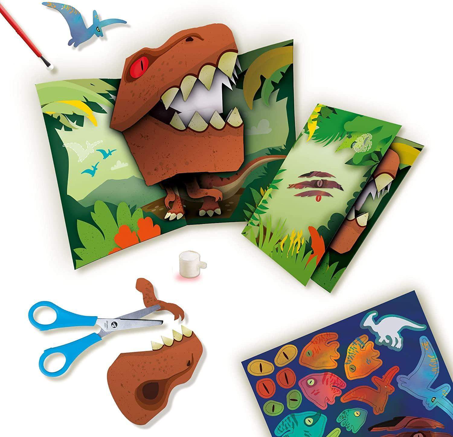 Contine: 3 carti pop-up; figuri de dinozauri decupate; foarfece; autocolante cu efect metalic; lipici; pensula.