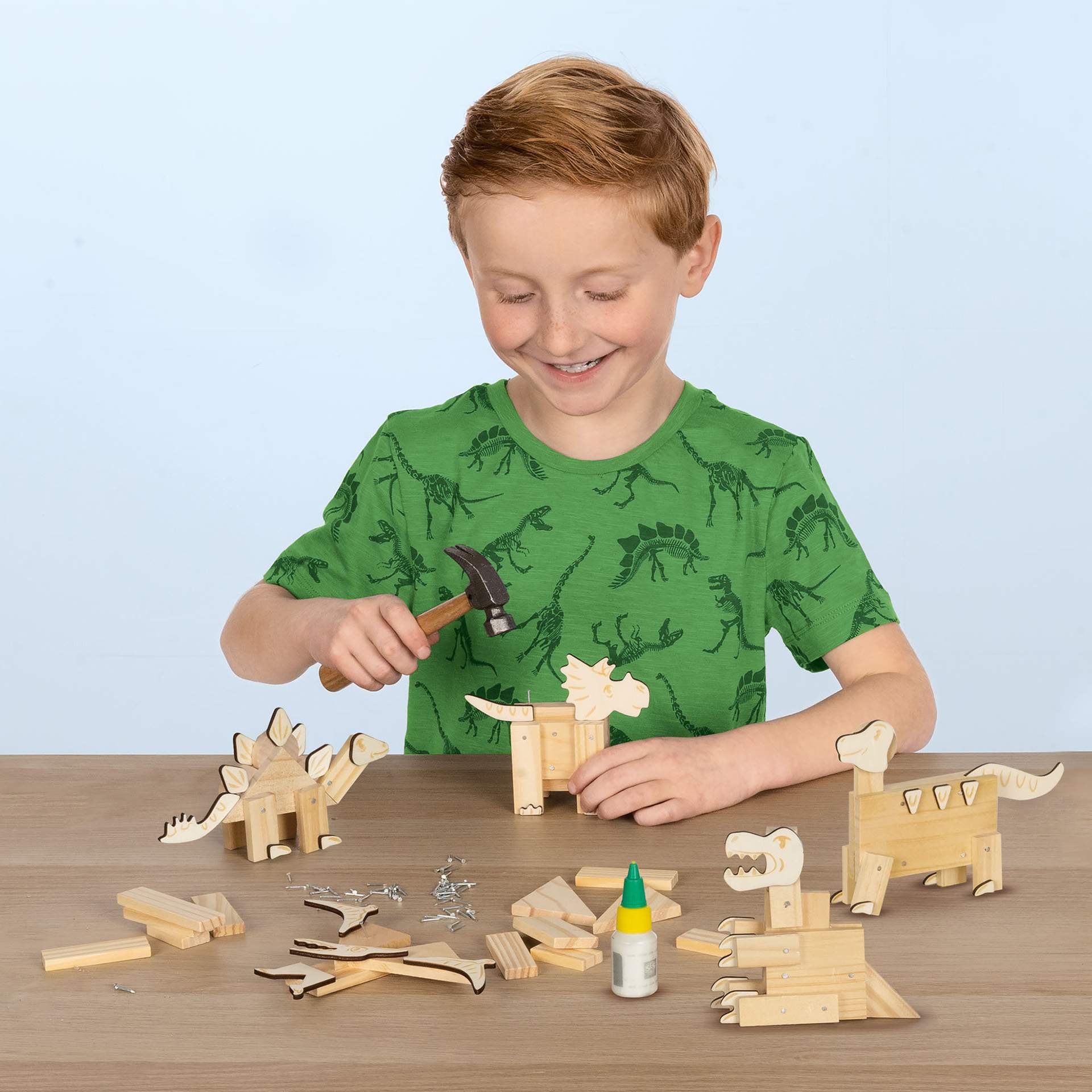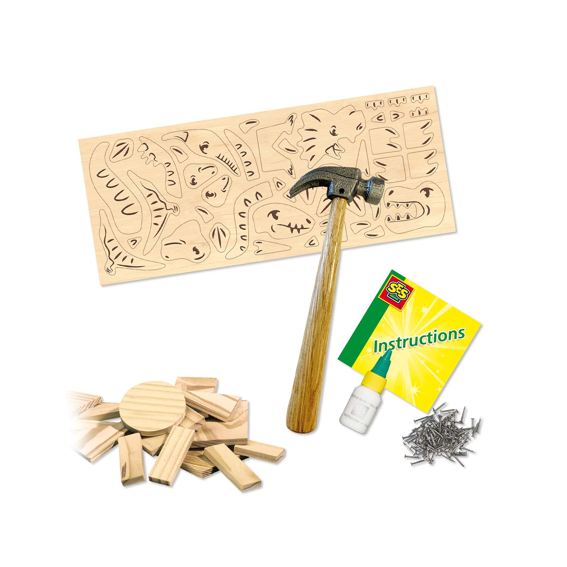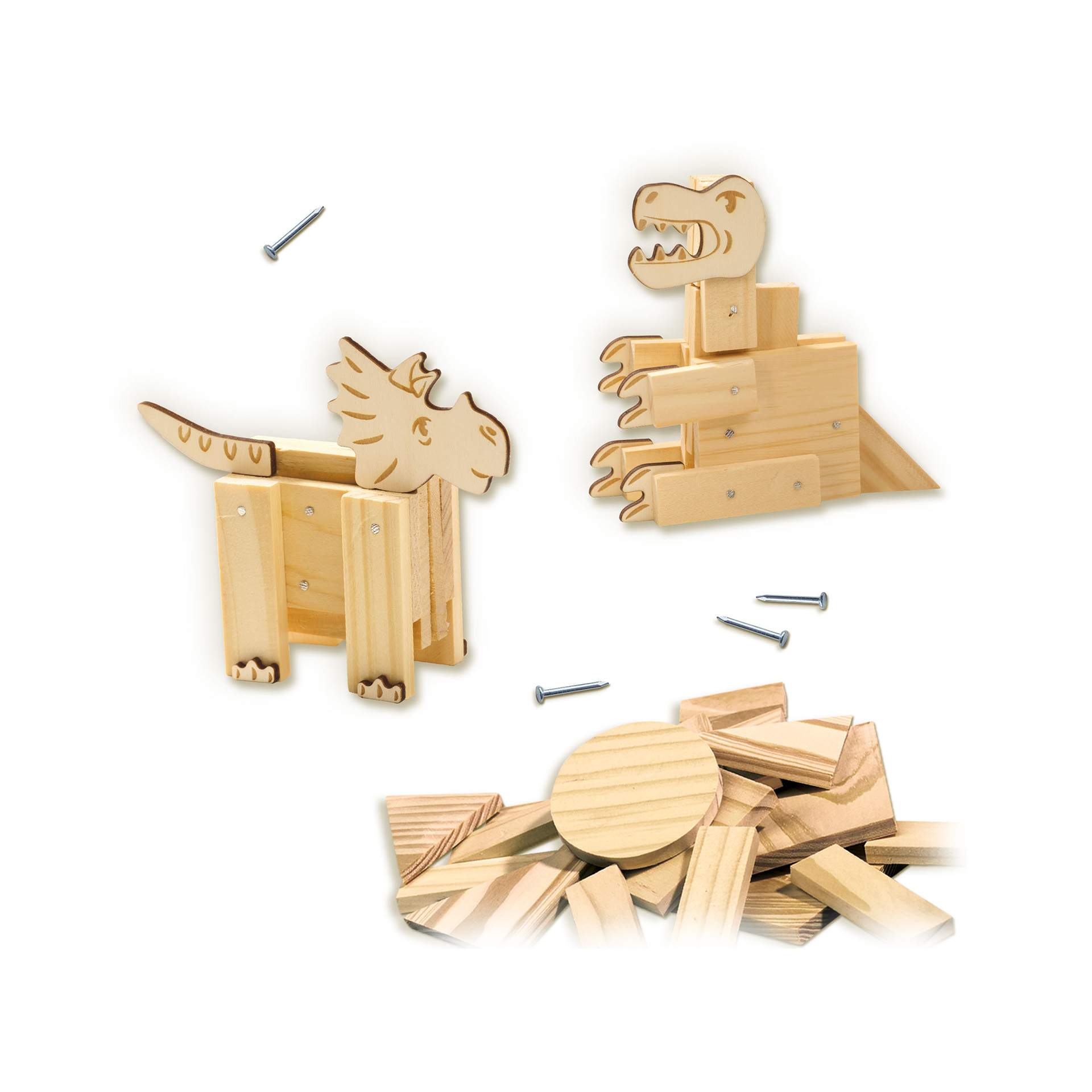 Contine: foi de lemn in diferite forme; forme de dinozaur din lemn triplex; ciocan; cuie; lipici (20 ml); instructiuni.