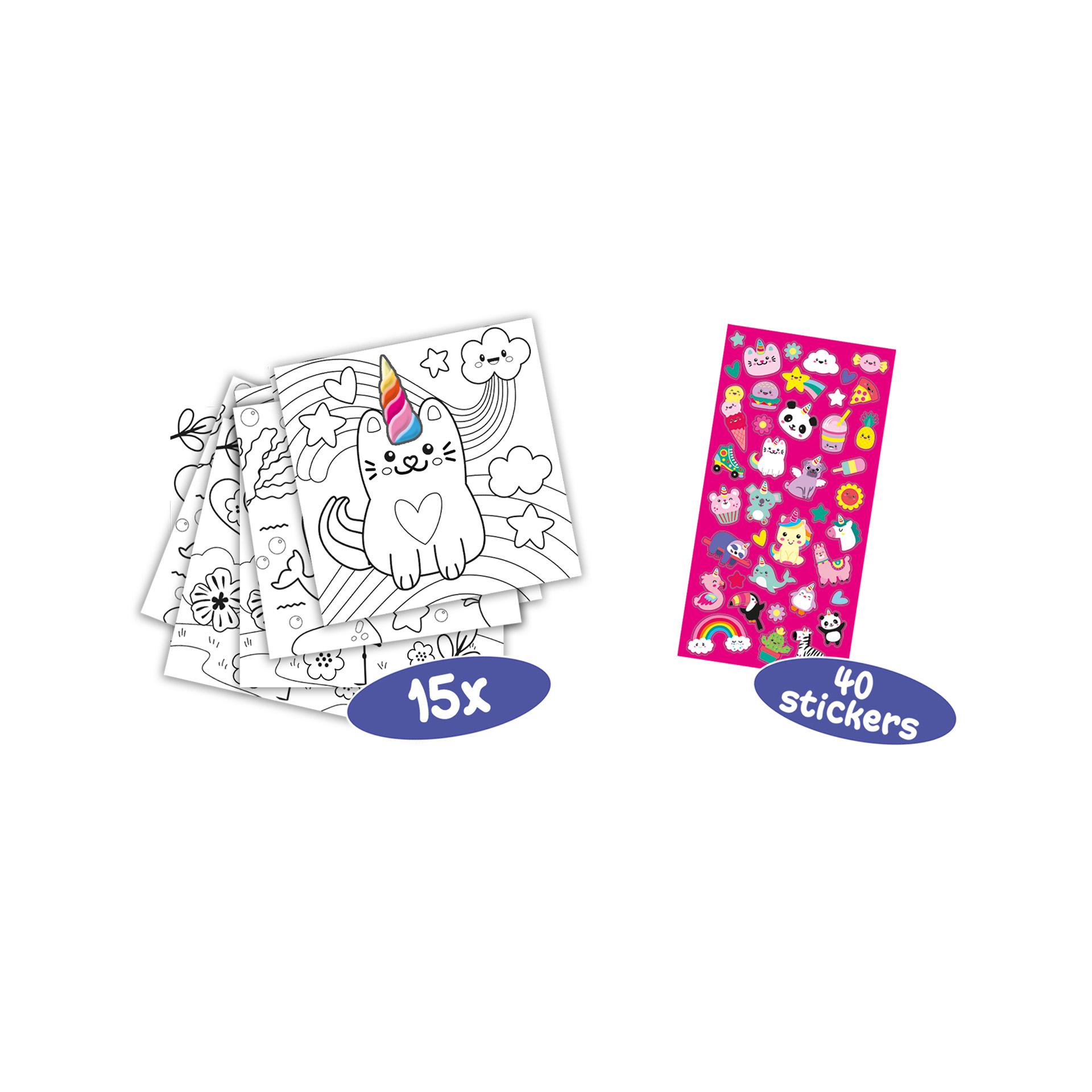 Contine: 2 foarfece zig-zag; 2 role de banda washi colorata; 6 foi de scris; 8 carti postale; 19 stickere inscriptibile; 6 plicuri.