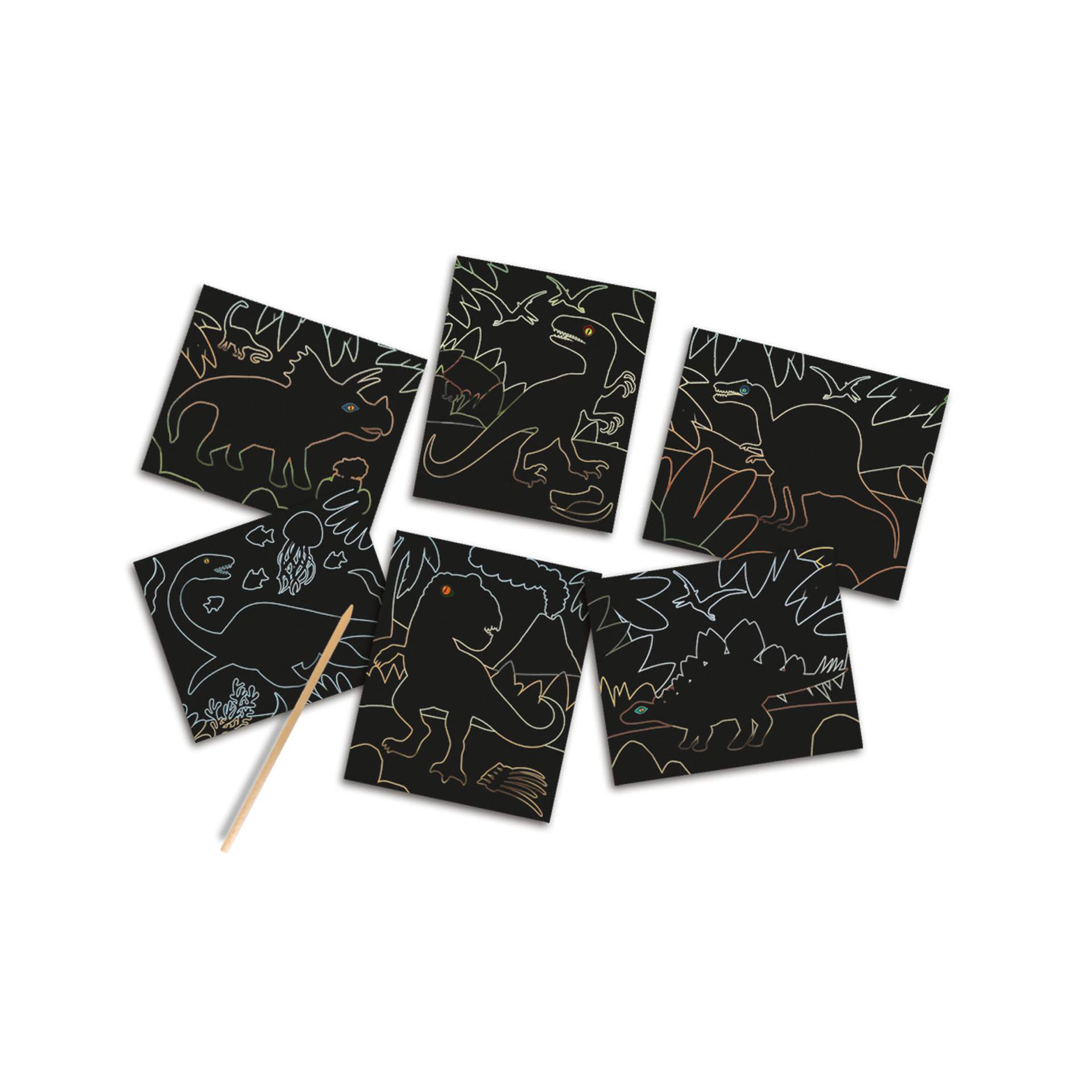 Aceste carduri razuibile au un efect foarte tare! Zgarie stratul care straluceste in intuneric de pe carti pentru a dezvalui diferiti dinozauri. Setul este format din sase carti de razuit cu un pix din lemn de razuit. Folositi pixul de zgarietura din lemn pentru a le descoperi unul cate unul.