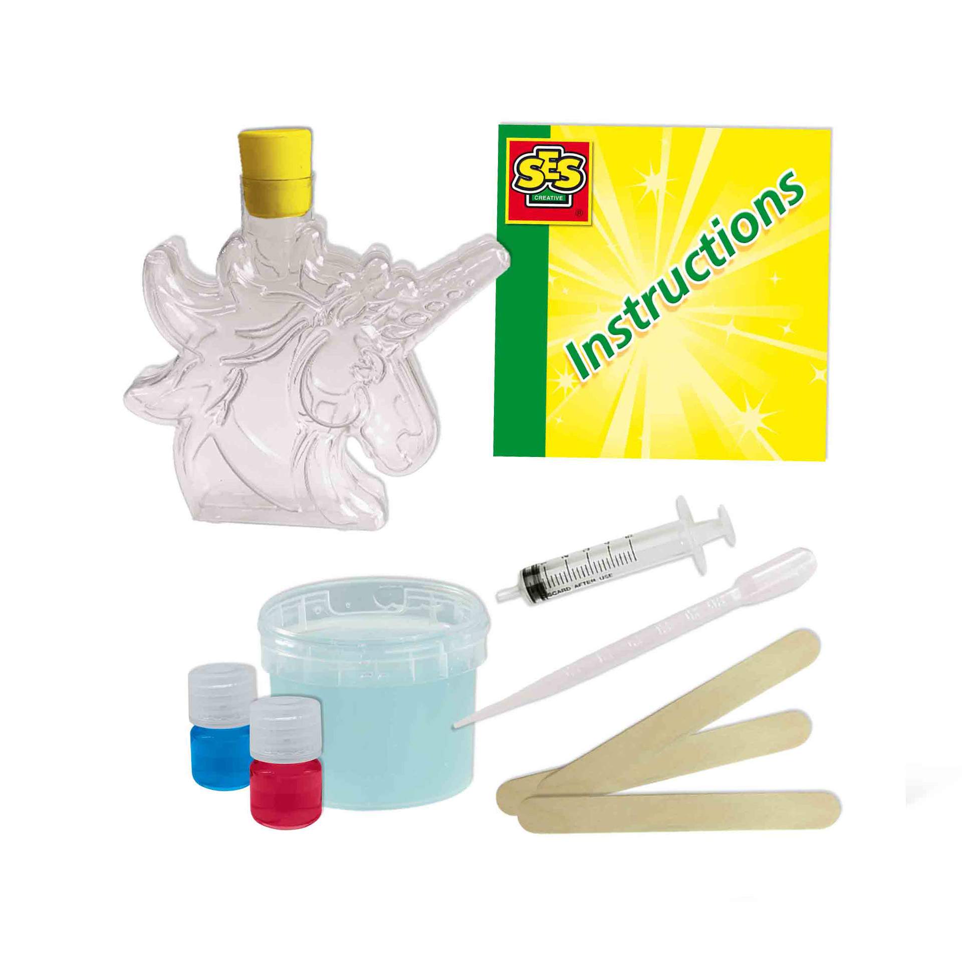 Contine: sticla unicorn; slime transparent; colorant albastru; colorant rosu; 3 agitatoare; pipeta; seringa; instructiuni.