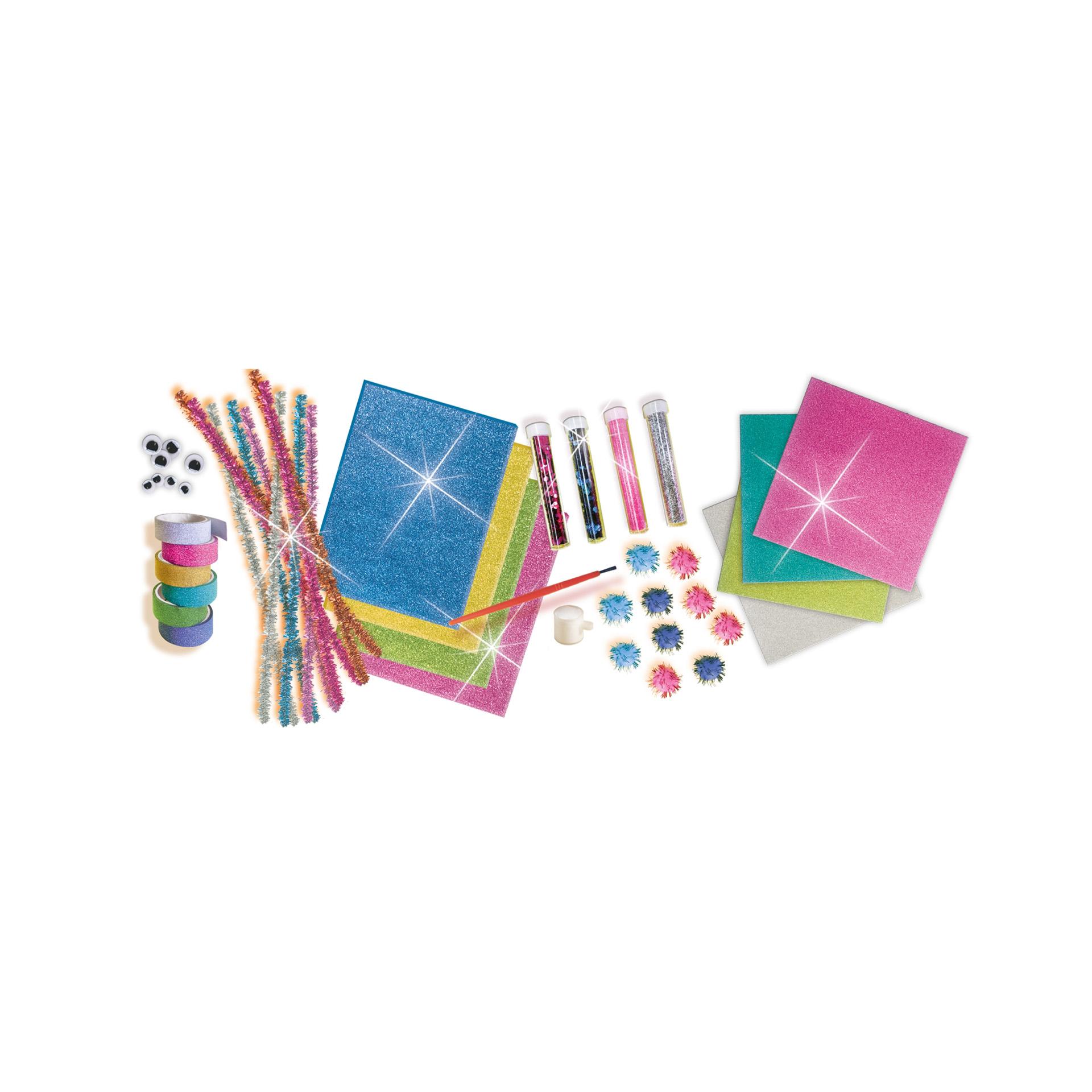 Contine: banda cu sclipici; pompoane cu sclipici; stofa cu sclipici; hartie cu sclipici; spuma cu sclipici; 4 tipuri de sclipici in tuburi; cupa de lipici; pensula; ochi care se misca.