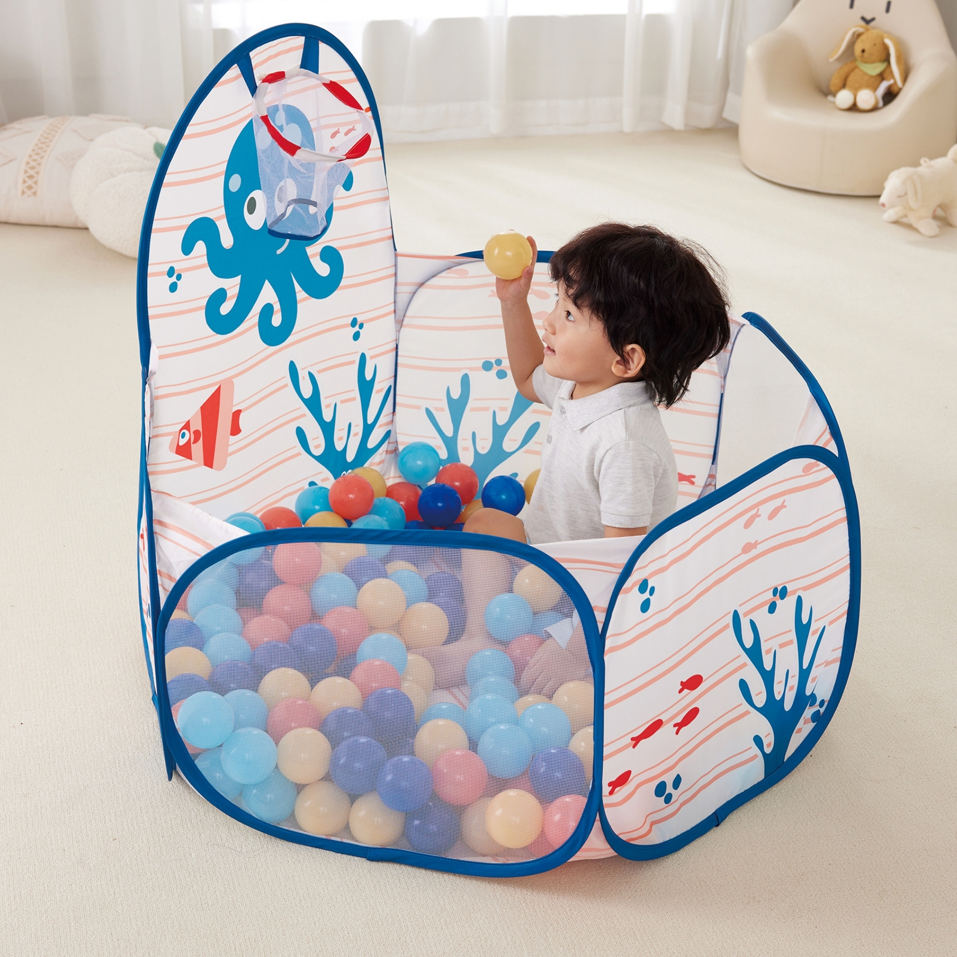 Transforma joaca celor mici intr-o aventura plina de culoare cu Tarc-ul de joaca pliabil cu bile – Ocean! Creat pentru distractie, siguranta si dezvoltare, acest spatiu de joaca inspirat din lumea subacvatica este alegerea ideala pentru copii energici si curiosi.